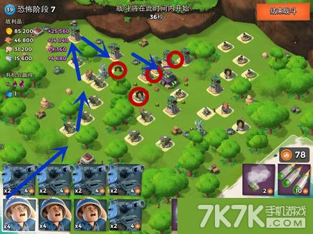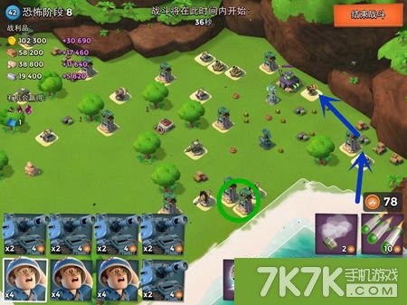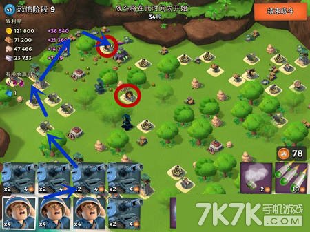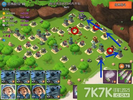 这关很简单,登陆后马上引导到右边的空地上,实在不行绿色区域使用1个震爆弹保护部队。然后轻轻松松一路拆到基地就可以了。
