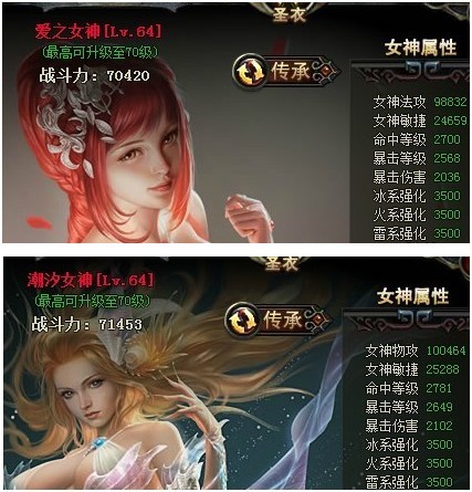 在初始属性方面潮汐女神高于爱之女神。一般同样的圣衣下,潮汐女神的攻击、敏捷都会比爱之女神高。
