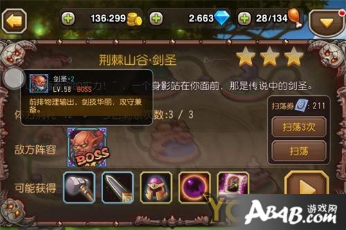 第六章的剑圣是一个单敌人的副本,三个场景都只有一名敌人,分别是风行、宙斯、剑圣。对于这样的单英雄副本,非常建议以控制流或者单体爆发流来解决。