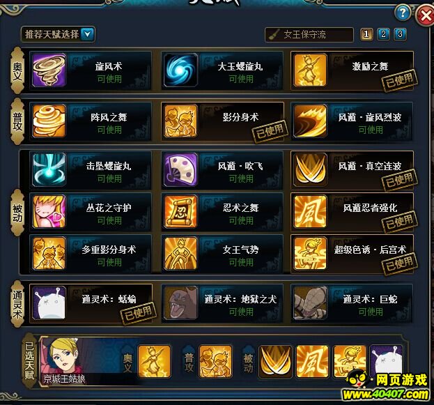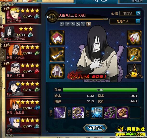注意说明:根据原创修改了天赋,优点在于目盲地狱道的话,他就不回血,鬼鲛死的快,如果第一回合大蛇丸连击一套,修罗又连击了一套,下个回合,鬼鲛就定身,大蛇丸就找地狱奥义
