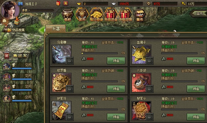 5、装备调整:夏侯淳配最好的装备,以强防、强攻为主,确保实力最强;甘宁次之,以强防、强攻、强壮为主;马超以强防、强攻为主,带少量掌控(不能 太多,提高低档率,节省粮食)和强壮;许褚不用多说,剩下的都是他的。总之所有装备都向强防看齐,强攻次之,这两样真的是越多越好,血量统统洗掉,至于攻 击和防御,也还行,不过效果比强防、强攻自然要差点。