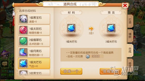 玩家可以打开主界面的“打造”,然后选择“合成”切页,就可以进行宝石镶嵌的操作。两颗宝石合成为一颗高一级的宝石,合成时需要满足以下条件: