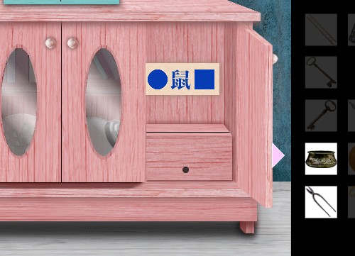 11.回到粉色柜子的房间对右边的柜门使用钥匙得到钳子,并发现蓝色的“●鼠■”