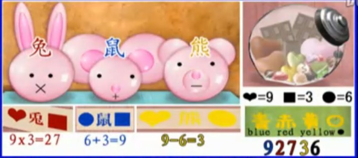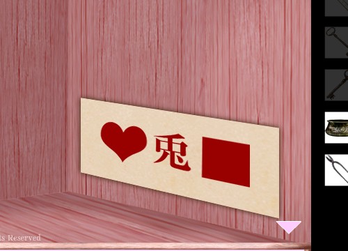 10.向上点击粉色的摆设,在最右边的粉色小熊下面拿到一把钥匙。观察3个摆设为“兔鼠熊”,他们的嘴部为“×+-”