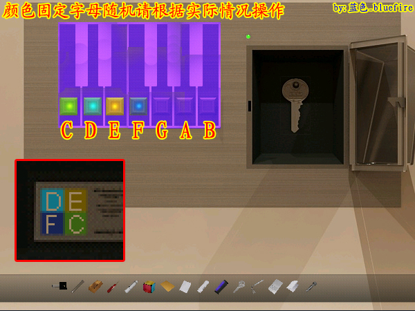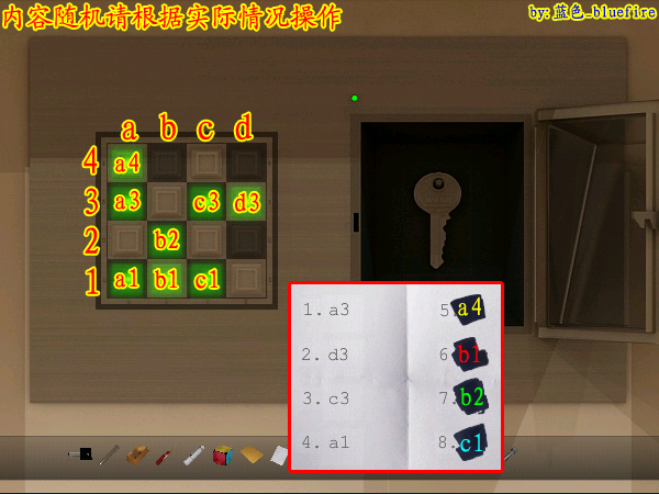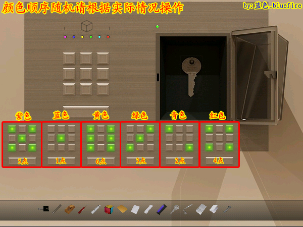 根据箱子里标签上的4个彩色方块和里面的字母(参看第8条),把对应的4个按钮按成方块的颜色,右边的盒子打开,拿钥匙-1,后退2次。