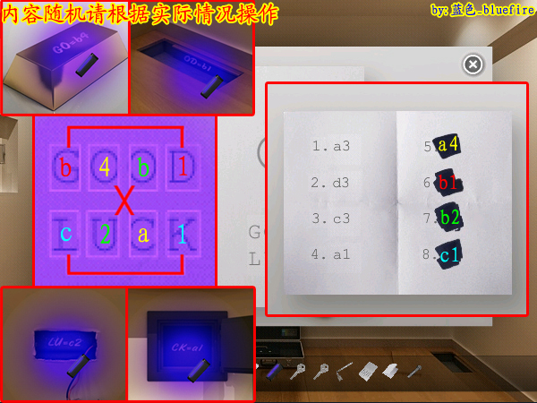 根据提示纸-3上的内容和第24条得出的结果,按相应的8个按钮(按的顺序任意,无所谓哪个先按),右边的盒子打开,拿钥匙-3,后退2次。