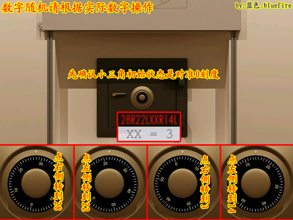 13、右转,点墙上暗格里的保险箱,点保险箱中间的密码锁,根据上一条的结果,先把密码锁上的0对准小三角,然后向右转到28(顺时针转)、向左转到22(逆时针转)、向右转到3、向左转到14,密码锁打开,打开保险箱,拿扳手和音乐盒,后退。