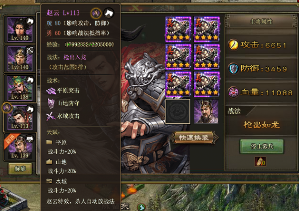 赵云属性,统80勇60,全地形神将,战术为非城池地形全部加成20%,战术*出入龙,打三排,但是赵云的战法与众不同,他为非手控战法,唯一的触发条件就是杀死对手后才能触发战法。