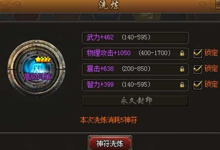 第二种:首先洗出武力、物理防御等你认为不需要的属性,然后锁定,建议锁定一个。因为这样花销不会太大。比如锁定物理防御后,然后一直不停的点(直到系统出提示你当前神策有金色或以上属性,是否继续洗练。