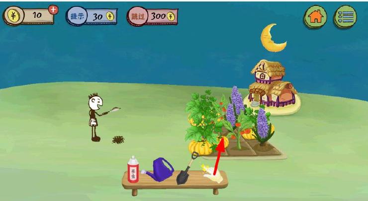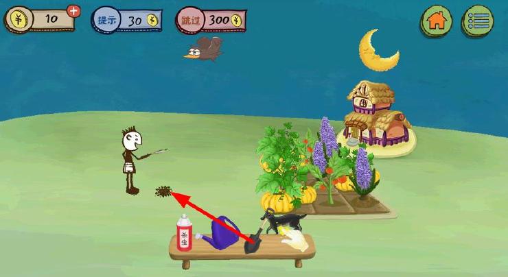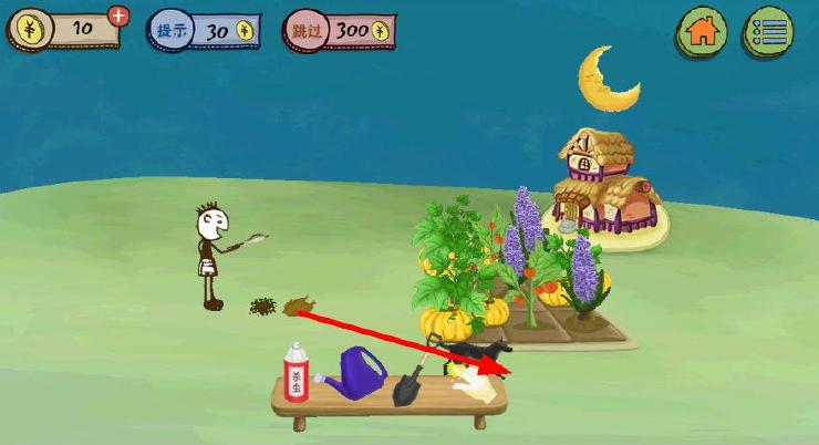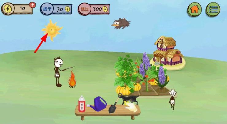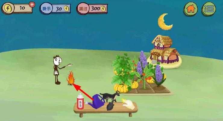 史上最坑爹的游戏3第15关攻略:用水壶灭火,再用铲子挖被浇灭的地方,出现一只烤鸡,把烤鸡给狗,再点击太阳,天黑了,用手套去偷菜;