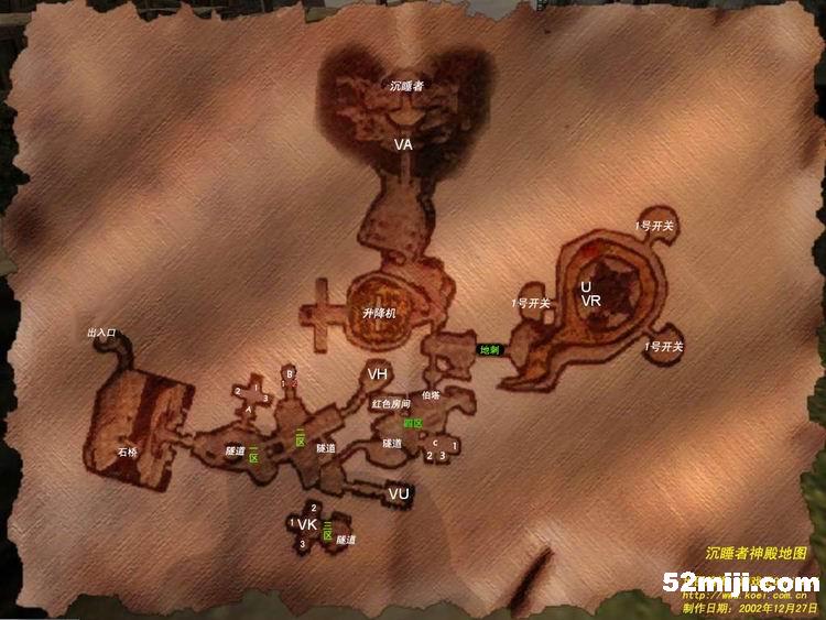 巫师,把邪恶的沉睡者带到了这个世上,因此,首要任务是找到这5个巫师,并杀了他们,从他们身上取得一件类似于古剑的道具,本身这5个巫师是很强的,他们是用魔法攻击,但由于游戏的Bug,主角和NPC都一样,攻击魔法除了暴风术其它都放不出,因此,这5个巫师基本上属于面人,6-7刀就能砍死,每个还有8000的经验,地图中,大写V字标识的为巫师位置。过了石桥,进入大厅,消灭掉入口的骷髅兵群,发现包括隧道在内的入口,都关着,此时需要进入A号机关,A号机关在一个石室里,大厅左手边,门口有个按钮可以开启,打开后,当你走进石室,石门就会自动关上,重新开启的开关在两边铁牢里。A号的开启步骤请看地图。A号打开后就可以进入二区,同时隧道入口也开启了,可从隧道进入二区或三区。二区有B号机关,根据地图,开启1,红色标明的2为陷井。B号机关开启后,通往四区的入口开启,由隧道进入。先干掉二区中VH标识位置的巫师,进入VH所在石室后,出口会被封住,干掉VH巫师后,从他身上搜得一把名为辟天剑的东东,插入出口处地上那个的奇怪的孔,可以重新大开石门。再通过隧道,到达三区,干掉VK巫师,VK巫师所在的房间,当你进入时,就会关闭,周围有三个机关,每启动一个,会出来一个小恶魔,按地图指示开启,转动最后一个机关时,VK巫师就会出现,杀了他,从他身上取得道具,插入奇怪的孔,重新开启铁门出去。再根据地图,走到VU法师所在的石室,杀之,进入后,石门同样会关闭,此时,正前方有个台子,走上去后,台下的铁门会打开,重新开启此门的开关,在地下室的石棺上,有个绿色按钮。再从隧道走到四区。两边分别是被血染红的房间,和C号机关。C号机关的铁门是关闭的,而C号机关正是开启圣战士伯塔身后的那个铁门。[笔者注:C号机关室的外面的石碑上有一些图案,就是一个人用弓箭射击一个花形的图案,笔者理解,就是用弓箭开启门的开关,笔者转了一大圈,发现除了C号机关室有两个与石碑图案相同的图形外,血红色的房间内也有一个,而在血红色房间的此图案下,有个按钮,可以开启血红色的房间的一道石门,石门后有一具骨骸,地上有一把剑,药剂和一个冰壁术的法卷,如果用弓箭射击血红房间的那个图案,会触发血红房间的陷井,房间关闭,地刺伸出,可以倒置主角的死亡,但不能开启C号机关室的铁门,所以笔者一直没找到C号机关室铁门的开启方法]说来惭愧,笔者进入C号机关室的方法,最终只能以Marvin模式的穿墙术(K)进入。