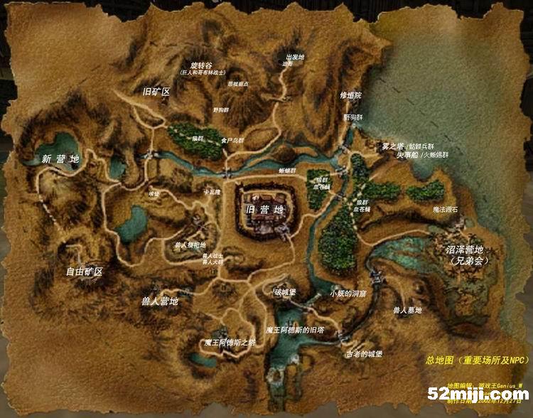 到新营地,会在去找法师的路上碰到宫尔,他知道了大概的情况,叫你先找克罗诺斯谈谈,再去找沙图拉斯,找到克罗诺斯,和他交谈一下,告诉他大概发生的情况,贝利昂死了,兄弟会的导师们发现沉睡者是个恶魔,他会叫你去见沙图拉斯。走上去,找到沙图拉斯,他很愿意帮你,你把魔法源石和年监交给他,他表示很愿意帮你,但还需要其它的几个魔法源石,并给了你一张地图。根据地图的指示,先顺路找到巨人山谷(或叫旋转的山谷),很意外的你碰到了迪哥,他似乎也知道魔法源石这事,他顺便帮你一起战斗(2人组队时,不论谁打死怪物都有经验),先干掉黑哥布林及巨人,进山谷的路上,会捡到一个日记,上面写着,巨人很强大,剑,弓都攻击无效,要用锤攻击(魔法大概也可),迪哥会帮你在前面吸引巨人,你只管在巨人背后打好了。打死巨人后,顺便扒了它的皮,跟着迪哥往前走,会看到一个绞盘,不过似乎坏了,迪哥会帮你修好它,启动绞盘,后面的那个山洞就开了,直接上去,干掉几只鸟人后就可以拿到魔法源石,迪哥叫你自己小心,后会有期。接下来去第二处地方,离新营地也算近,按地图指示,可以找到那处,可以碰上一个火法师密而顿,和他交谈,得知那个墓穴内也有他想要拿东西,但他独自一人不敢进墓穴去,你要求和他合作,他说钥匙被一个守护者看守着,属于不死生物,要解决掉他会有点麻烦,不过他有个办法,他有一个专杀不死生物的魔法卷轴,拿了卷轴和密而顿一起进入墓穴,杀掉骷髅兵后,用魔法解决掉那个丧尸守卫,从它身上搜得钥匙,开了宝箱,取得第二个魔法源石,并给密而顿所要的东西。按着地图指示,到兽人的地盘去找第三个魔法源石,这个地方被称作,大山贸易站,一路上有很多兽人犬和兽人战士,兽人斗士等攻击力和数量都蛮多的怪物,小心应付,最好采取,引诱杀敌,一个一个杀,这些家伙攻击力虽高,不过一般三四剑可以砍死。走到大山贸易站的途中,会经过两个桥,第一个桥上有个石怪守卫着,剑和弓攻击无效,而且被打上就晕,如何解决?简单,只要你有锤类的武器,三下可以砍死,推荐用神锤+52攻,沼泽营地铁铺可以买到。