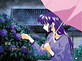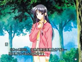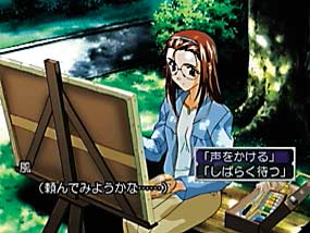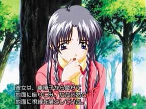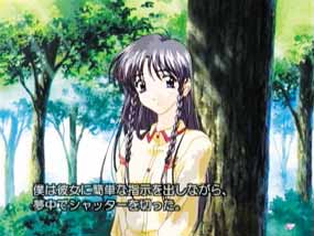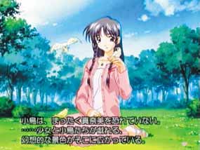 | 绿之精灵- 在翠绿的树阴下,一位少女在跟小鸟游玩,可是一转眼间,她就不见了?到底她是人还是…?到了第二天,发现除了她之外还有另一位妇人,她还称妇人为「婶婶」。(现在该确定她是人了吧?)可是在不久之后,我到医院去看少女是否在时,却见不到她,我只好失望地离去。第二天再去时,还是见不到少女,反而遇到少女的婶婶,我请求少女的婶婶,让我为少女拍照,得到的回应是请我亲自询问少女,另外,我还得知了少女名为「真奈美」。 为真奈美拍照- 几日后我再次到医院去,今次终於找到真奈美,我立即请她成为我的模特儿,经过一番努力之后,她终於答应了。拍照过后,我写了一封信给她,并把照片也放了进去。到医院后我请婶婶帮我交给她,想不到很快便收到了她的回信。经过几次通信后,她慢慢地对我减低戒心。后来,我从婶婶口中得知原来真奈美小时候曾经喜欢过一位男生,并在两年前她跟他重遇了,正当他们的感情渐入佳境时,那个男生却死了。婶婶说,原来真奈美把我当成是那个男生,并请我继续跟真奈美通信,为了真奈美我只好答应。 小鸟与真奈美- 某天我到庭园去,看到真奈美一脸想哭的样子,原来是小鸟的巢破了,而小鸟亦掉在地上。不想看到真奈美的泪,因此我便答应真奈美为小鸟制做一个新的巢,几天之后我带着工具把巢做好,期间发现真奈美常常望着小鸟的方向,真可爱。第二天再去找真奈美时,她又给我一封信,在信中她除了答谢我为小鸟制造新的「家」之外,还说自己现在开始写点小诗。感到真奈美慢慢变得开朗起来,我也感到很高兴。 为鸟欢喜为鸟忧- 今天真是高兴极了,真奈美竟然亲自邀请我为她拍照!愉快地把她带到庭园去,看着她跟小鸟快乐地游玩着,我亦不断按着相机的快门,今次拍出来的照片一定很捧!但想不到第二天再到庭园时,竟看到她抱着小鸟害怕地坐在地上!原来小鸟被狗攻击,真奈美虽然勇敢地对抗着,但还是怕得直发颤。看到我的到来,那头狗连忙逃开,而我亦送真奈美回到房间,她真的开朗了很多呢,不再是软弱无助的样子。 |