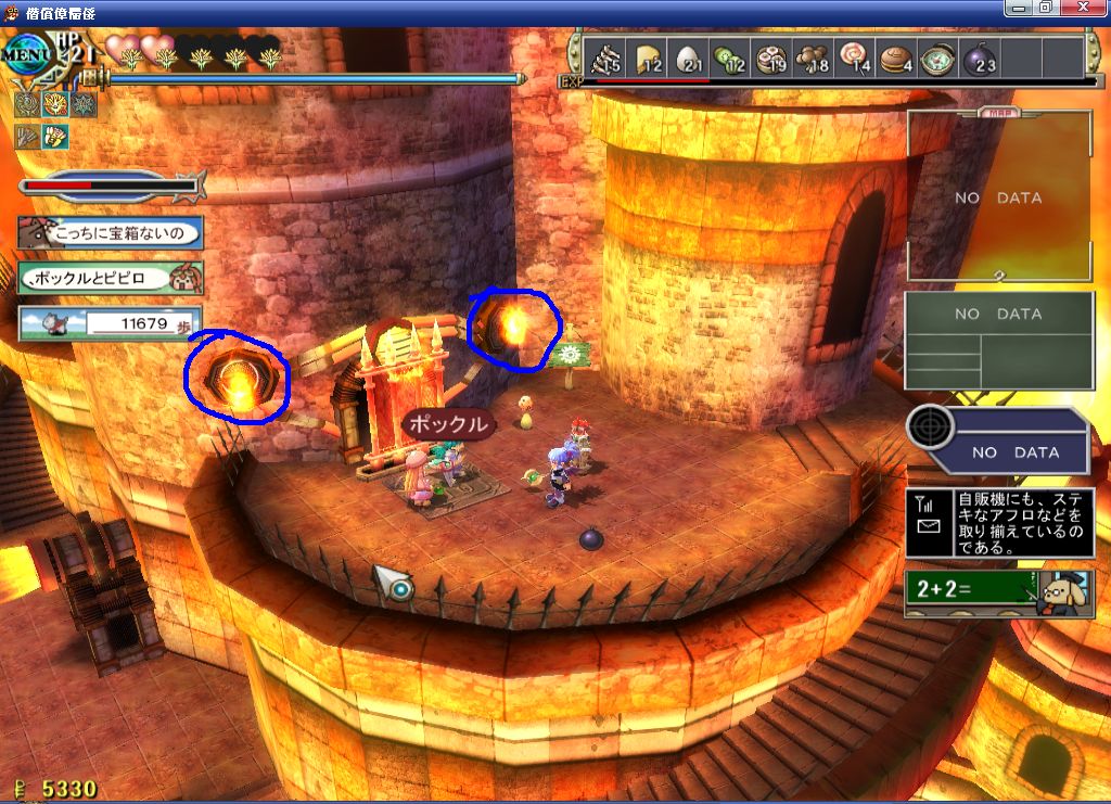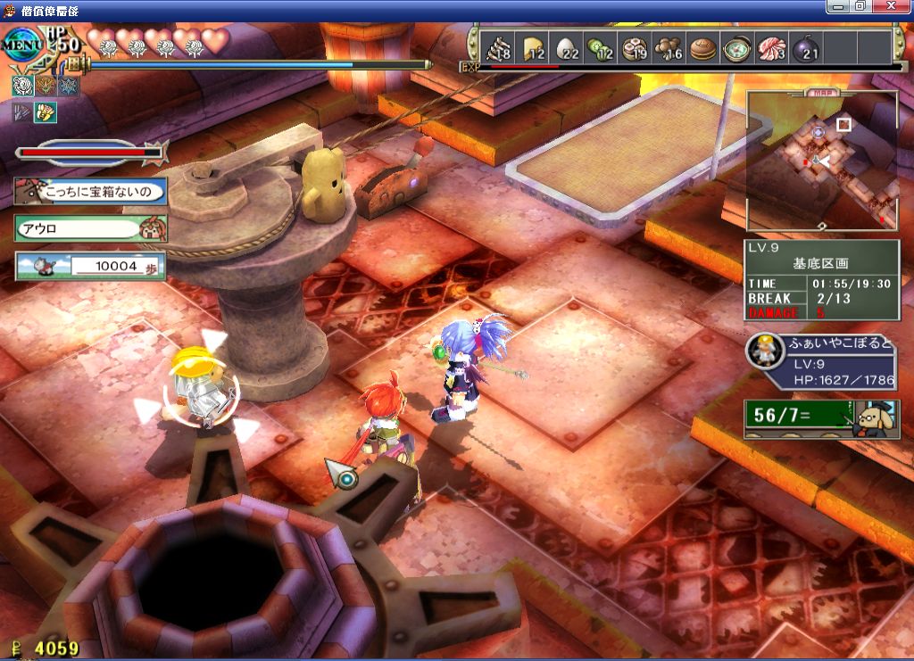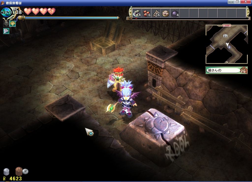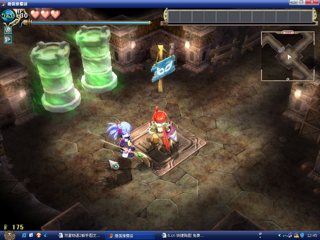 第二层 4个罐子 把三个开关都打向右边门就会开了 2层里有2个电铃,敲了以后天上掉下一堆怪都是分2次掉的,没说的杀吧!建议电铃2的地方先用炸弹把大炮炸掉。电铃2往上一直走有个箱子 +2防御的饰品。