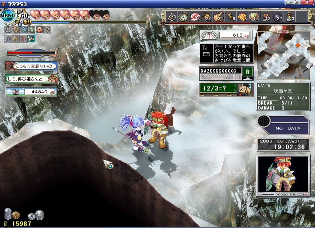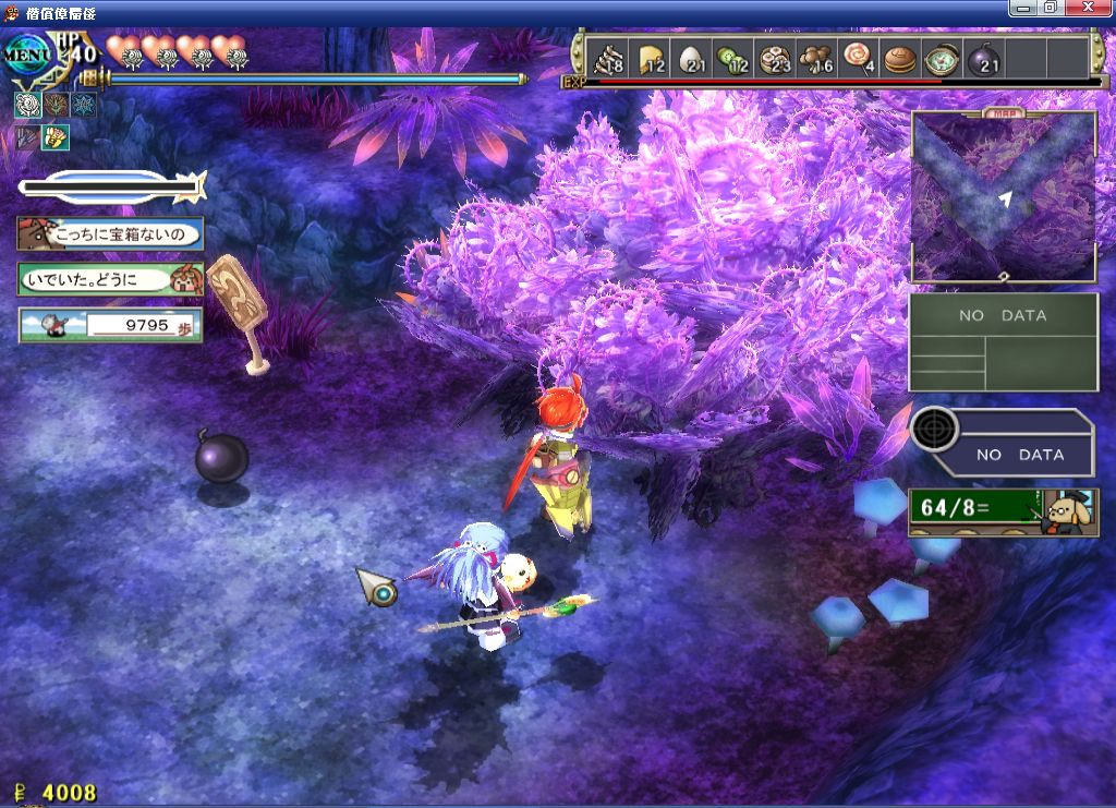 键盘:方向键移动。Z键跳跃/取消,X键选定/男主攻击 C键女主攻击,A键切换武器(按下去游戏会进入暂停状态),S键吃东西(按下去游戏会进入暂停状态,你又足够的时间选择吃什么),CTRL可以快速略过对话(比你狂点鼠标快得多)V键是释放奥义