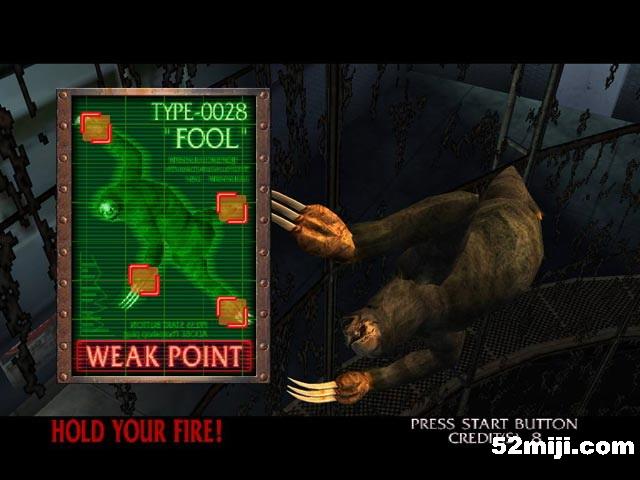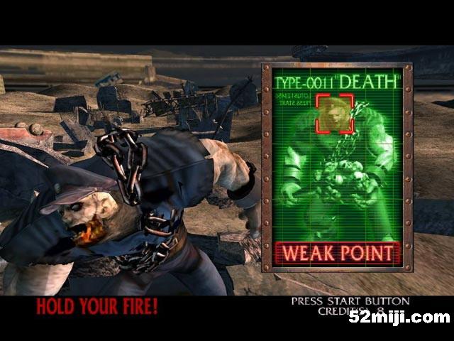 注意,《死亡之屋3》中BOSS的攻击不是一枪就能击退的。在BOSS的绿色的血槽的下方有一个橘黄色的攻击槽,你要攻击BOSS的弱点,将攻击槽内打空,这样他才不会攻击你。如果没有打空,那就惨了,“嘿嘿,吃俺Death一棒!”。打攻击槽的同时BOSS也在掉血。对于Death我可没什么说的,就看你打的准不准了。他的攻击槽6枪就可以打没,不过由于他总是用棒子来回挥舞,所以你要多打几枪。每当把他的攻击槽打没后,他就会停下来不再追你。这时你就要打那些小兵。打完小兵后再继续打Death。这么打了几个回合后,你就和G一起进入了一扇门里,门正好关上,Death打不进来了。
