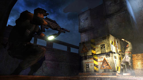 从出口的扶梯爬到发射站内。迅速溜到一旁角落里躲蔽巡查的探照灯,然后伺机将中心塔楼上的看守击毙。切换到热视模式发现草地里埋着地雷,扒在铁丝网上向顺时针方向前进,直到从另一排铁丝网爬进旁边的小院。