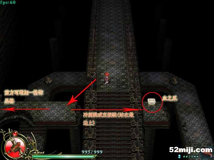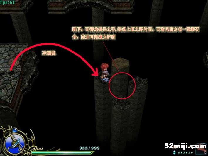 冲刺跳:向前跳并在空中砍(跳的距离是普通跳的1.5倍)早期日文版没打冲刺跳补丁时,是很难发出冲刺跳的,中文版的比较容易发出,是打过补丁的说。用冲刺跳可拿到很多较好的道具。具体操作方法:方向键+攻击键+跳跃键.之间的节奏感如音乐节拍中的,1.2.3