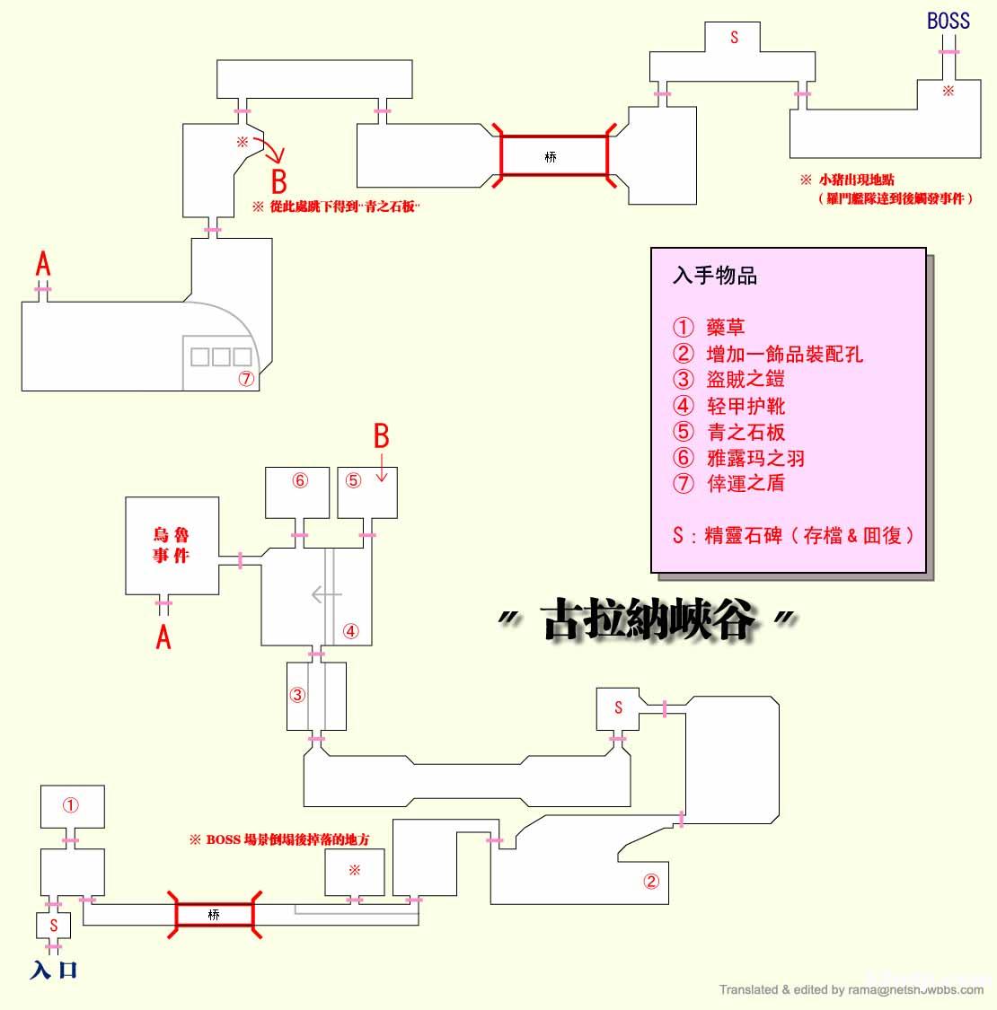 和族长对话,选第一项,可得▲利瓦特(风剑).到上方的洞中找到奥露哈对话后可得┃生命之种┃,刚出族,伊莎追来,给你一个攻防各+2的"●木雕手镯"(记得装备啊)-----祈祷之泉,那里新出现了一条路(忘却之遗迹),里面的蜘蛛较历害,对付它们用下刺。这里等级低的,可多多练级,用风剑共鸣打开蓝色的门------路遇黑色男子(盖修)打败他,继续前进(红色的门暂时进不了)-----到暗道出口遇见扎克松和洛伊德,对话后,来到利摩奇-----转一下后,马上赶回到原来的吊桥处,可找到库瓦尔,回答“愿意”可得到◆“给巴司拉姆的信”-----回利摩奇-----左边可锻剑,右手里面道具店罗丝处可购得一些道具(▲钢圆盾,▲锁子甲,▲合金盾牌,▲合金胸甲,●白蛇手镯,●防咒护符),有钱一定要把这里的所有的东东都买光啊,这样可得◆“姐姐的威信”,以后凭这个在道具店门口找她的弟弟科洛亚,这样以后多的药品都可以高价卖出了.-----酒吧打听情报,从老板依赛克口中得知,城镇南面有位老人可帮忙-----到商会找巴司拉姆,给他信,可得30金------到镇南找到老人,他告诉了我很多关于这个岛的事情,还给了一张◆“迦南地图”。以后可以在道具里查看地图,知道自己所处位置.从老人口中得知,迦南平原北部有把剑,另外他的徒弟乌鲁也不知哪去了。-----迦南平原一直朝北到达古拉纳峡谷(左边的两个岔道暂不去)-----一路前进,遇石头怪,用下刺攻击,在中段可救到了乌鲁,(路上可得▲盗贼之凯,◆雅露玛之羽,▲幸运之盾,在一缺口处掉下,可得◆青之石板,●轻甲护靴,以及〓饰品装备孔还可加一格)继续前进到达剑之祭坛,捡到◆镜之碎片①-----一个红色精灵召唤出BOSS(建议等级:LV.22 风剑LV.6-7.弱点:腹部.跳斩攻击+必杀).击败后.可得▲布里兰特(炎剑)