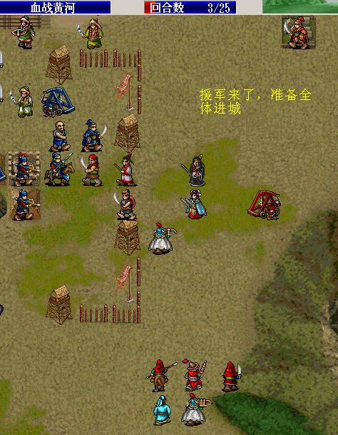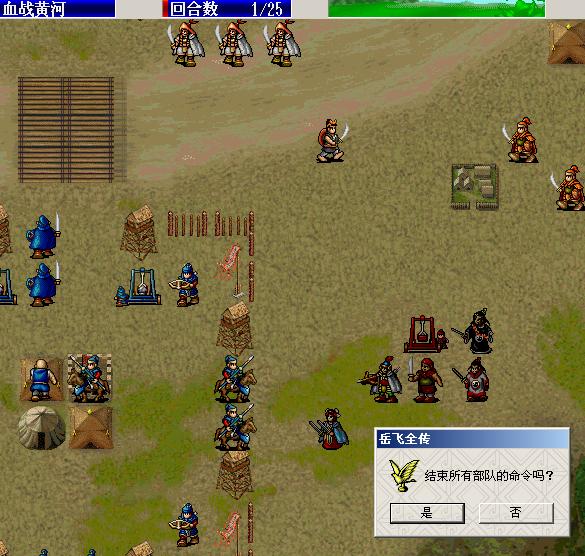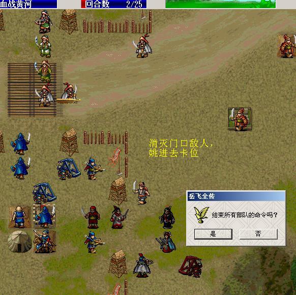 (4敌人主将死亡后,岳飞接近忽必烈触发破防,本人未让忽必烈出场,抄录)又是对恐怖的蒙古骑兵。左边还有一群弱智的送粮队。注意观察送粮队的路线,别堵上了,否则这帮家伙会奋不顾身地冲上去杀敌。只要有一个送粮队死,你就输。送粮队真弱智啊,一个家伙老是在左村和左门来回玩,就是不进城。