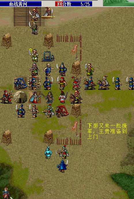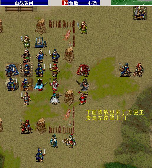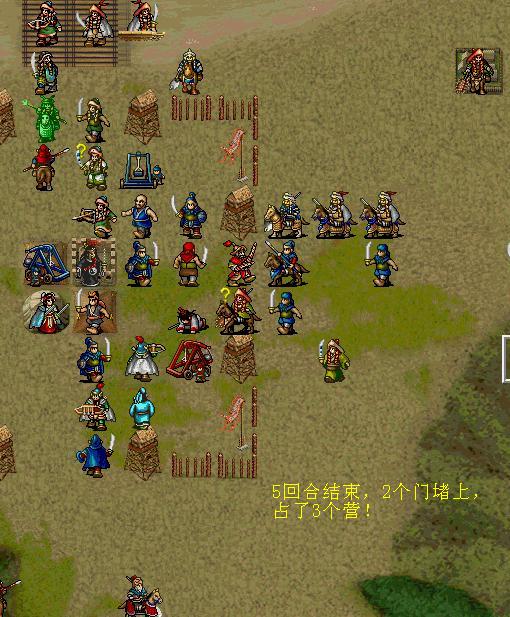 很简单的一关,就是时间有点紧。于鹏配诸葛兵法。先攻击左营:施全给自己加轻身后下来与大队伍会合;王贵往左吃颗“统帅力果”加防御,诸葛给张显加轻身往上,于鹏给吉青加攻。由于张显更靠近敌人,所以右门来了一大堆敌人,然后于鹏、诸葛、牛牛、吉青大规模杀伤,一下杀死 7个!后面都这样打,反正哪里敌人密集,就往哪里打。现在你最盼望的就是敌人快点来吧,来得更密集吧!到8、9回合时,敌人消灭差不多,只有右营来增援的走得慢的几个还没有送死。