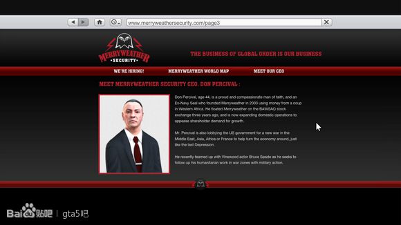 34. 最后一个任务选第三条路结束后唐·珀西瓦尔会发来一条短信说梅利威瑟股价大跌之类的,很多人不知道他是谁,但有一个主线任务里提到了他是梅利威瑟的高层人 物。并且用三个主角的手机上网会找到一个梅利威瑟的官方网站,上面有写唐·珀西瓦尔是梅利韦瑟的CEO以及他的详细资料(本人手打和翻译):
