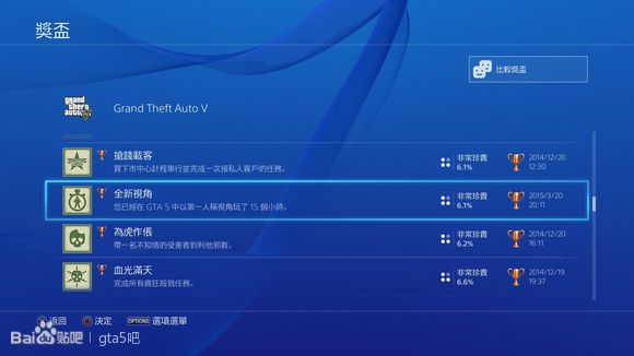 44. 次世代(XBOX ONE/PS4)GTA5所有隐藏奖杯除了一个外全是剧情奖杯,也就是完成某个主线任务就会解锁,但是还有一个就是次世代新添加的“全新视角”奖杯,目的 是以在游戏中以第一人称视角累积15小时现实时间,并且单机联机都能完成。查看进度请在游戏中点击统计资料内查看。