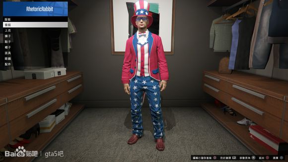 1.在独立日DLC更新的前提下进入任意服装店购买蓝顶泡绵高帽、星星装饰墨镜、红色燕尾服、垂直国旗背心配白色衬衫、USA领结、星星休闲裤、红色便鞋并保存