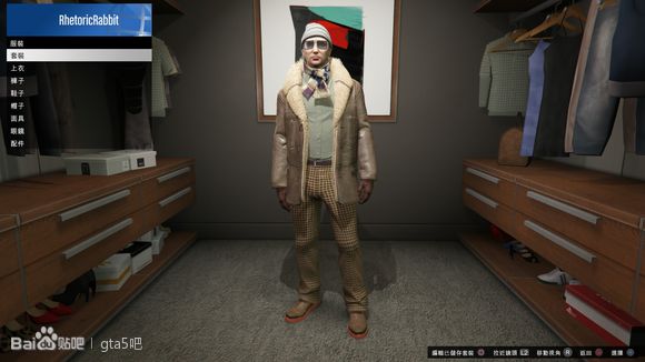 1.进入任意服装店购买灰色条纹冬帽、金色枕形耳钉(双耳)、公牛品味黑色墨镜、小麦色皮毛夹克、淡橄榄绿衬衫、小麦色格子羊毛围巾、棕色皮手套、复古针织长裤、橘色厚底雕花皮鞋并保存