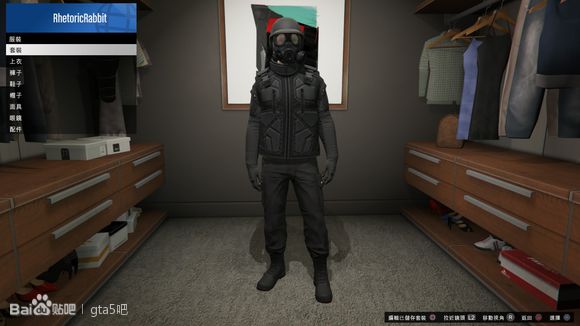 1.进入任意服装店购买黑色战斗护衣、购买灰色重型工作背心、炭灰色军用裤子、黑色战术靴、黑色耳罩、炭灰色军用手套、黑色宽边眼镜;