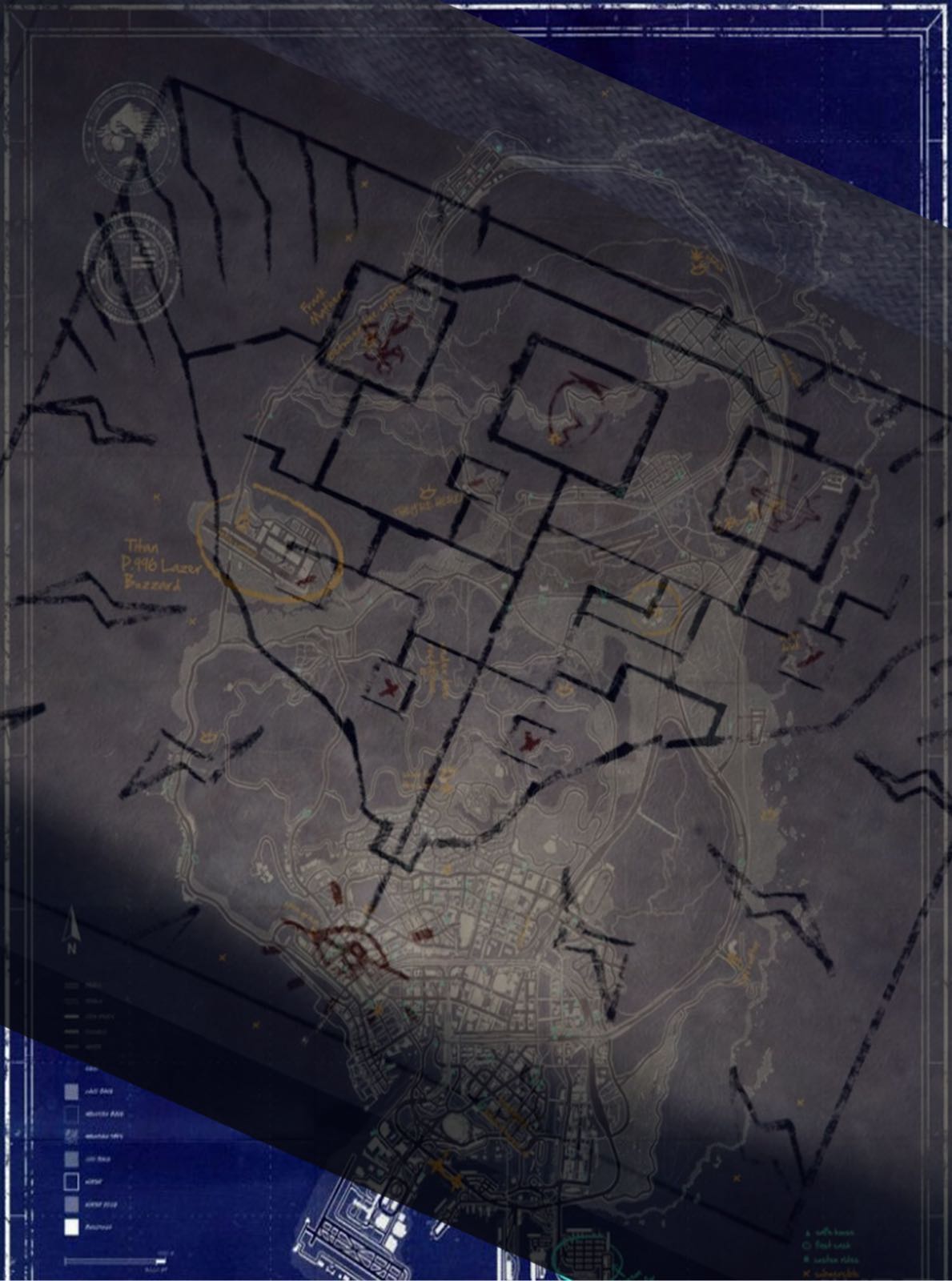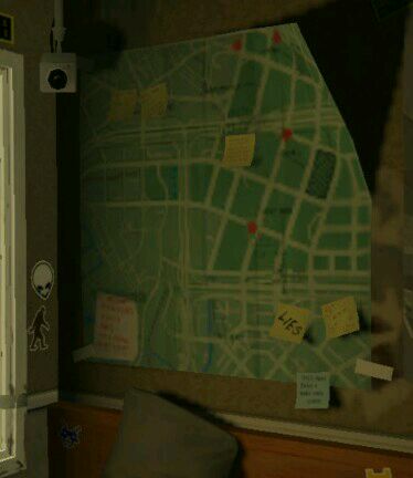现 在蓝图上仅有13个地点与UFO和外星人有关,排除的地点是:under the rockface,pink pool ,大桥顶,open grave ,SW rooftop,in the drink,rail cabin,Frank Mathers,between the cartes 。这些地点都是小彩蛋或者是直接,间接的给新手提示有武器。