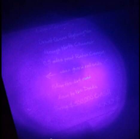 “T.P.E - 特雷弗·菲利普斯(主角之一)的事情,武器、麻醉药、恐吓信和休闲服装,高速公路北的Great Ocean,穿过Chumash北部,驶过Raton Canyon0.5英里,到护轨的尽头,再沿着那条烂泥路一直走到码头,带上50万美元现金。XXXXX”