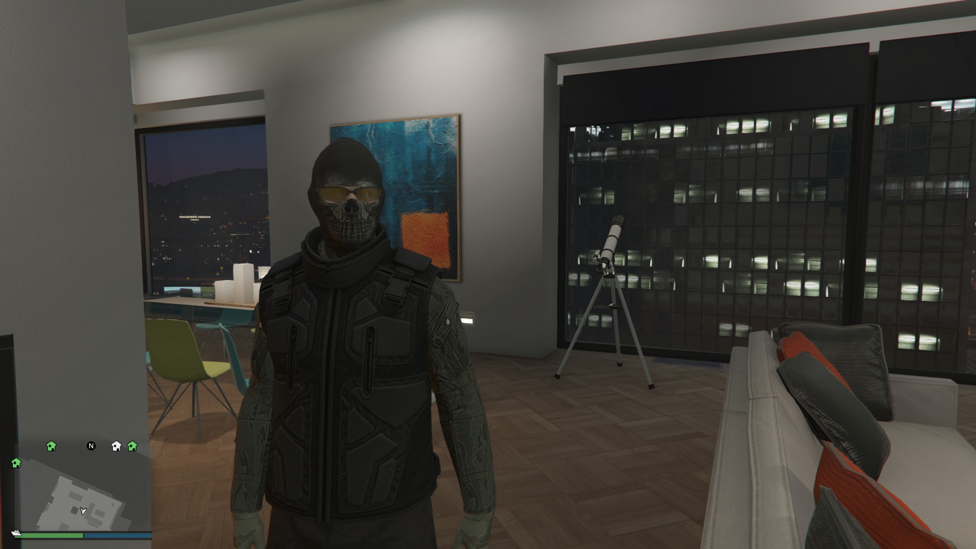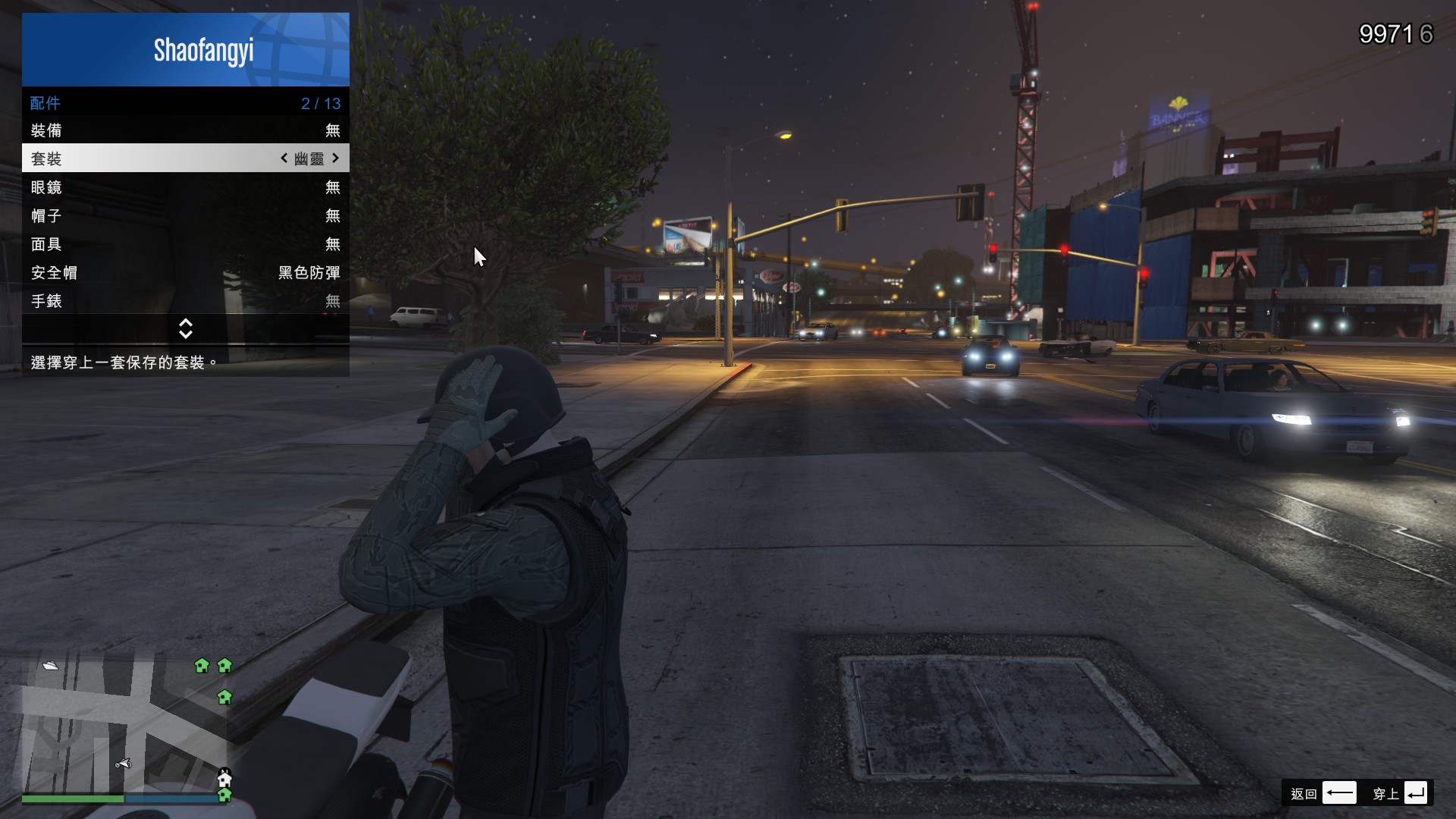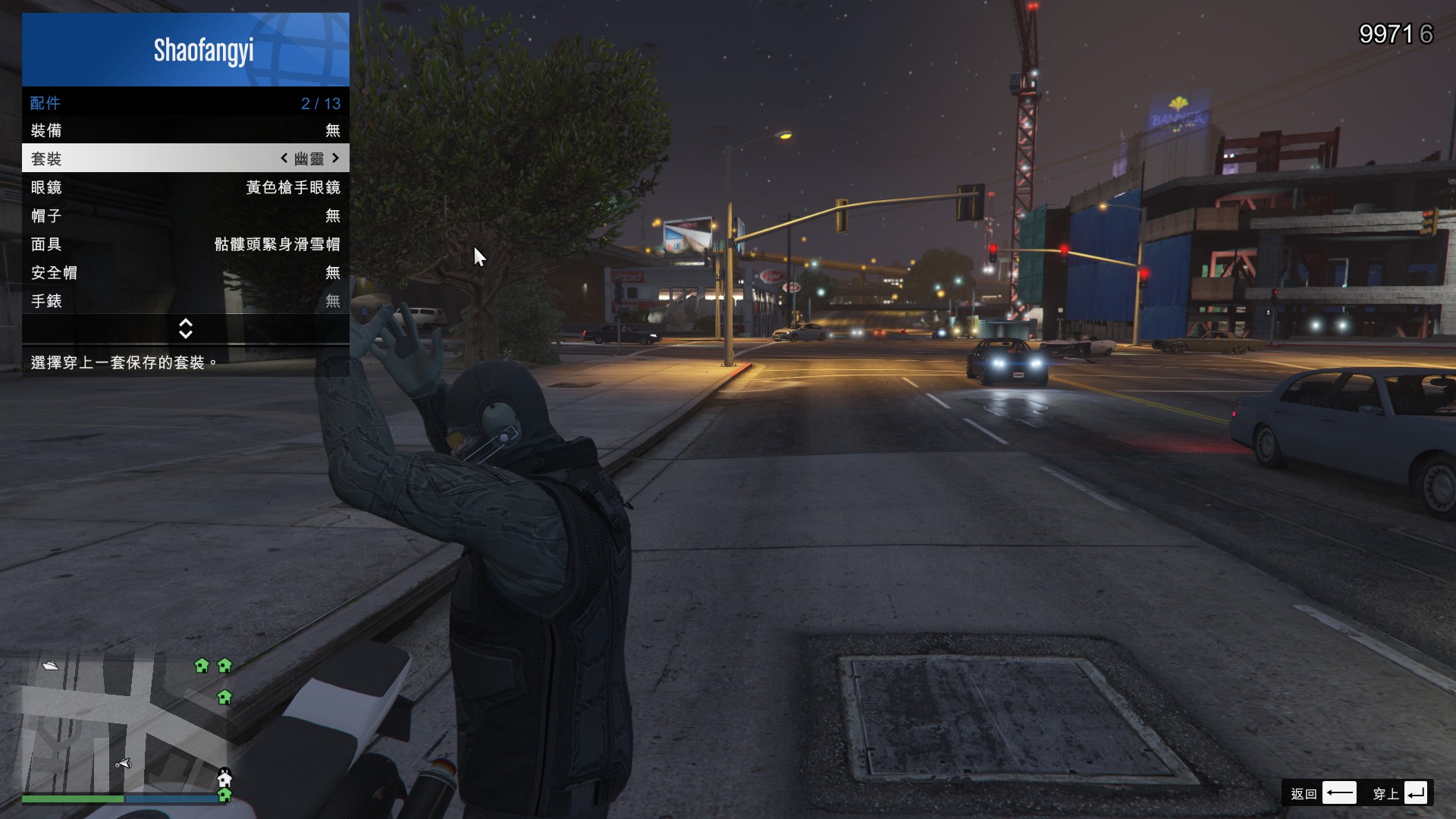 其实很简单,先买身连体服但面具那个保存为套装1,然后在穿重装骑上摩托车停在服装店门口,等他戴上了防弹头盔立即下车,在没脱掉头盔的时候,赶紧保存为套装2.然后换回套装1回到自家望远镜处 用卡幽灵眼镜面具套装同样的方法 调出M 然后换成套装2 离开望远镜即可