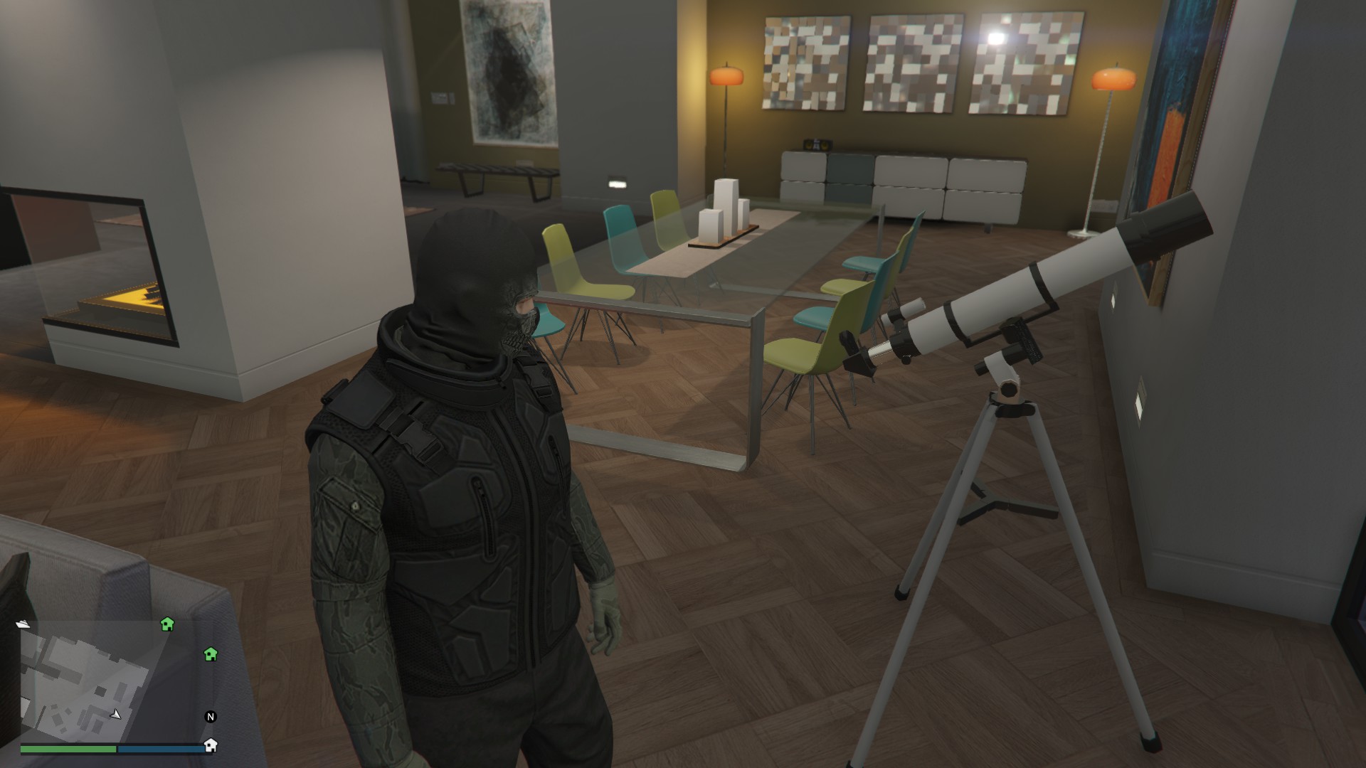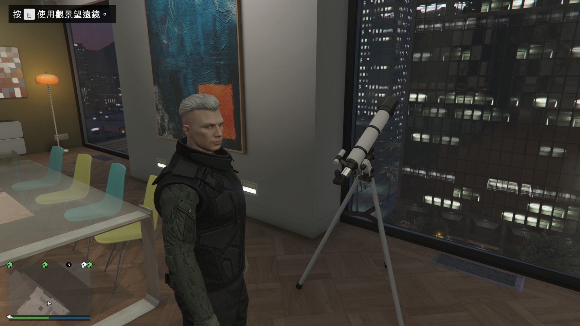 首先穿好重装,戴好面具,站在自家望远镜右侧注意一定要在系统提示按E看望远镜的范围的最远处