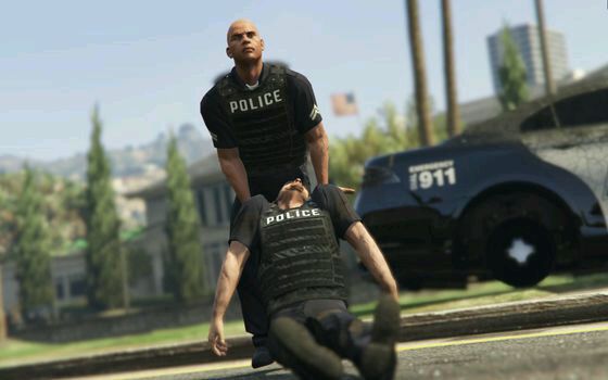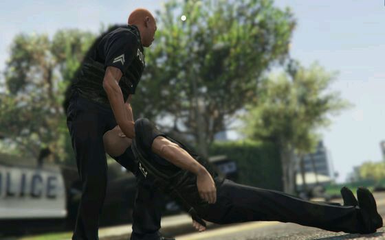 进去差事后,按M键打开列表,然后到平时换服装套装那一列表,翻到最下面有一个自动显示机车安全帽。来回开关几次(多几次),接着关掉列表,打开手机,选最中间那个图标检视差事,按空格退出。当你回到战局就会发现,警服仍然在!!!