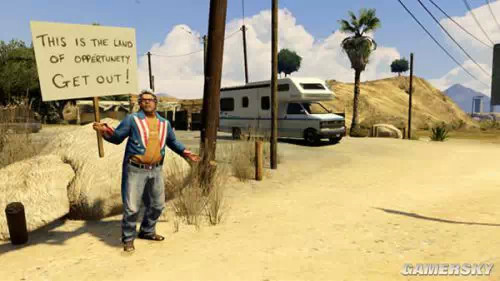 《GTA5》中甚至还有对电子游戏本身的嘲讽,老麦的废物儿子就是一个整天窝在卧室玩游戏的死宅,逼的老麦一气之下砸掉了儿子的电视,并破口大骂电子游戏对人类的残害;无独有偶,还有更加违反常理的设定,城市中的一位怪咖甚至会在各处义正言辞的宣扬起吸毒的合法性问题,并积极的寻找支持者,而主角们则会在吸食后经历一段奇妙的旅程。