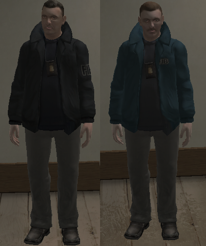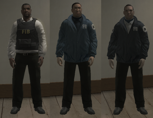 关于这里楼主有一点要说,在PC版的GTA: III中衣服显示的是FBI,而在十周年纪念版中,他们的衣服上写的是FIB(然而车辆名称未变)。以下统称FBI。