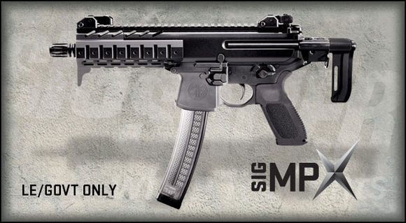SIG MPX冲锋枪是西格武器公司于2013年最新推出的一款武器,有9mm巴拉贝鲁姆、0.40英寸史密斯韦森、0.357英寸西格3种口径型号。该枪采用 AR系步枪的设计风格,弹匣卡笋、快慢机/保险、空仓挂机的位置和操作方式均与AR系步枪相同。该枪采用伸缩式枪托,上机匣与护手为一体式设计,顶部设有 整段皮卡汀尼导轨,用于安装光学瞄准镜。护手侧面预留有导轨安装孔,必要时可安装导轨。