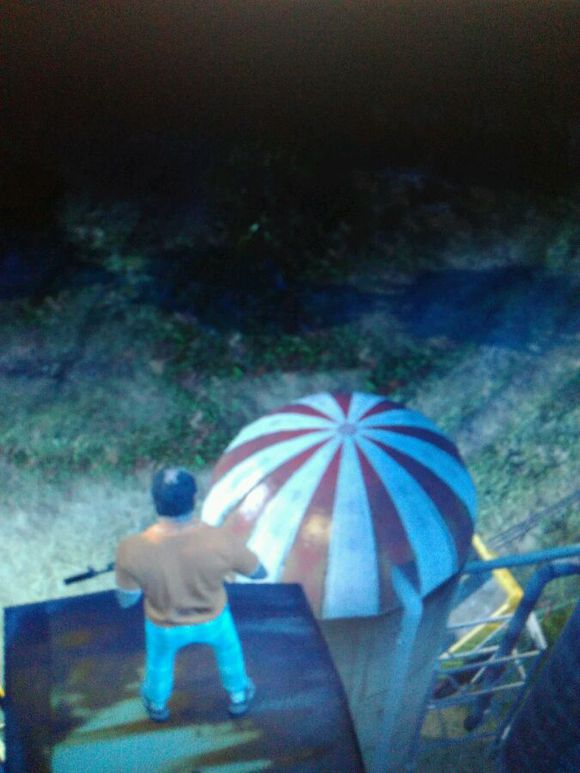 既然得到的新图案c山顶上的UFO图,那么我可以把这幅图和缆车站的那副图重新组合,我们可以发现,闪电是直直的劈在蛋上,以至于蛋破裂(这里不要想歪)