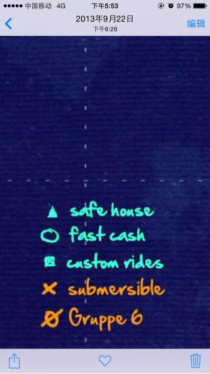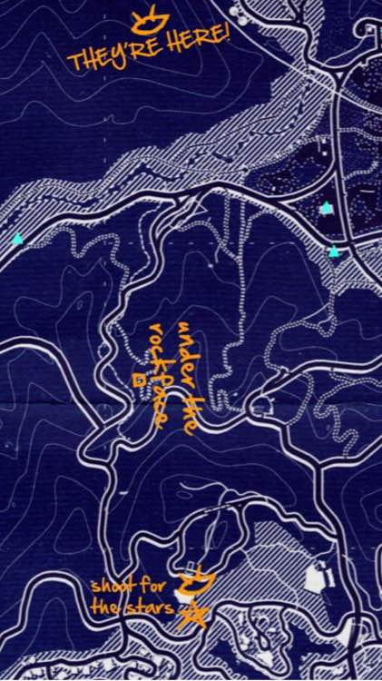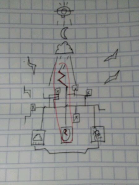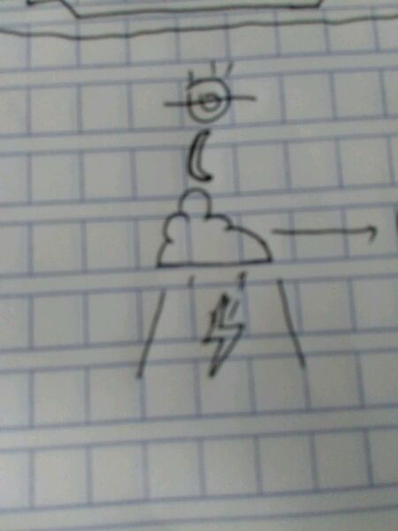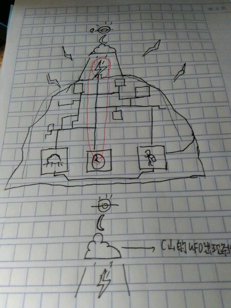 新看法:(这里再盗一张图,sorry)我认为三个图案极有可能是这三个ufo:雨云对应c山上的ufo,闪电对应军事基地的ufo,也可能证明了beam me up 这句话,而月亮正是另一个出现在外星人公园附近ufo。