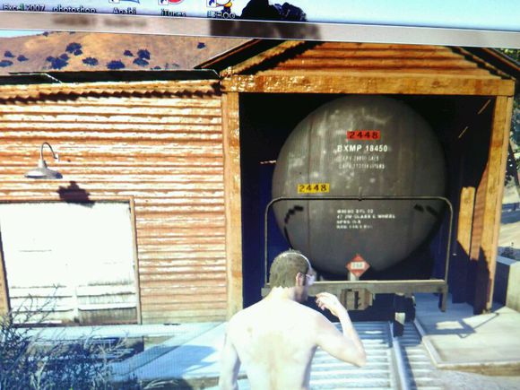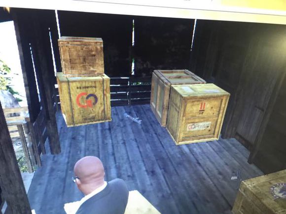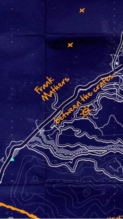 between the crates,在条板箱之间。这个地点在邪教村,而且唯一比较符合文字的只有这里