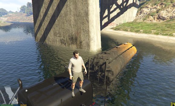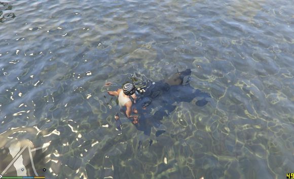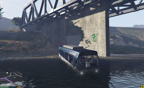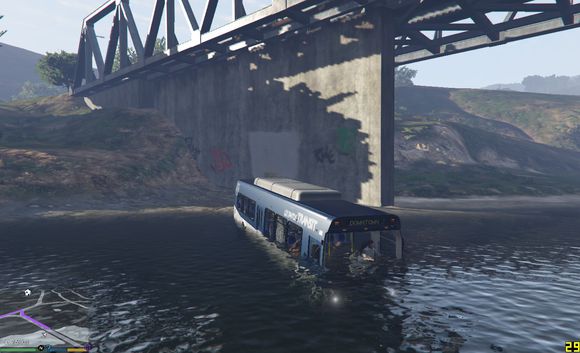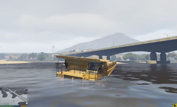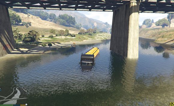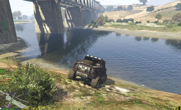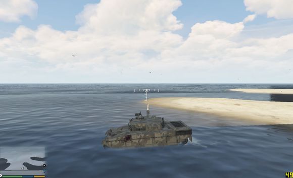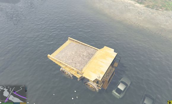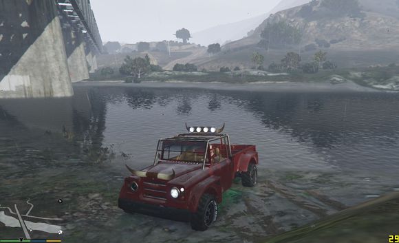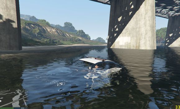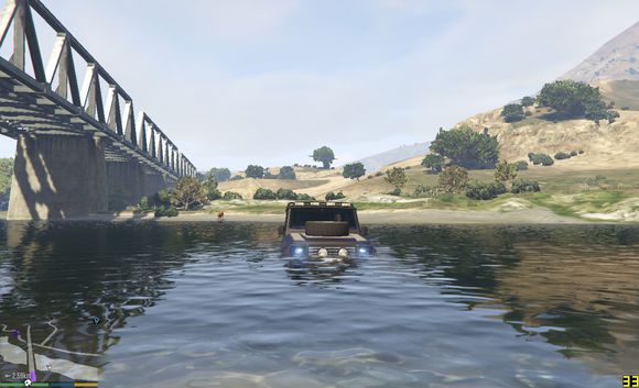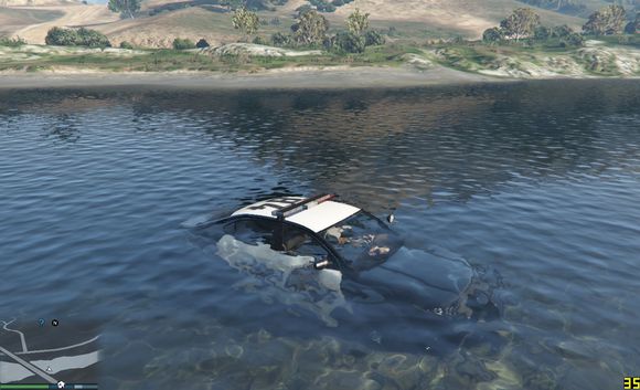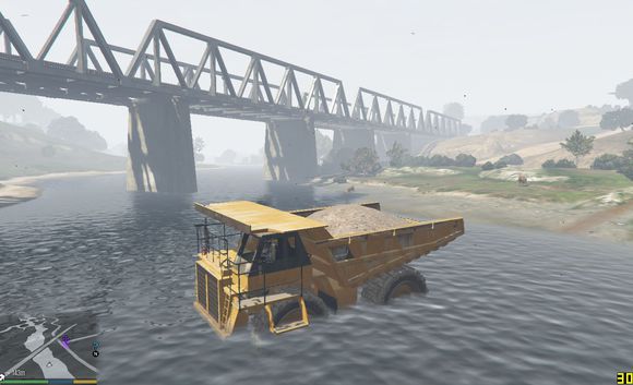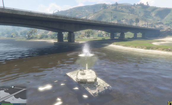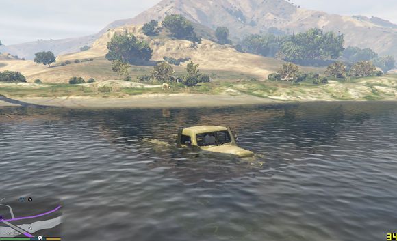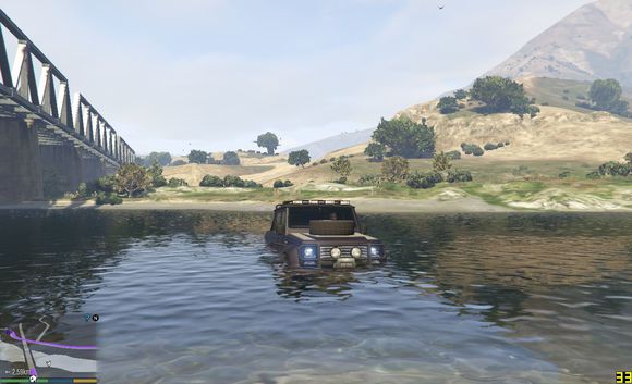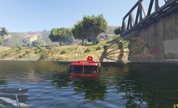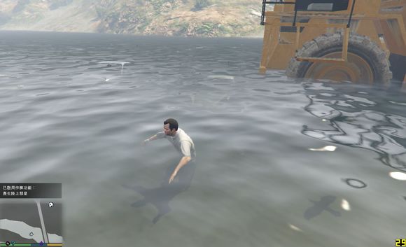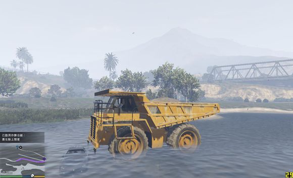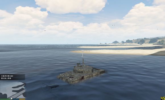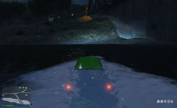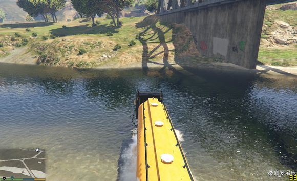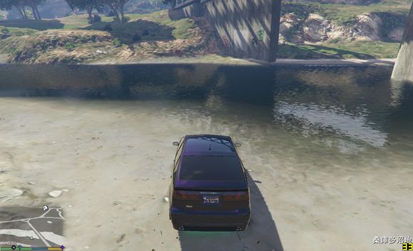 尝试快速通过,无奈车子太轻,浮在水上得不到抓地力靠惯性在水中冲到一半沉没