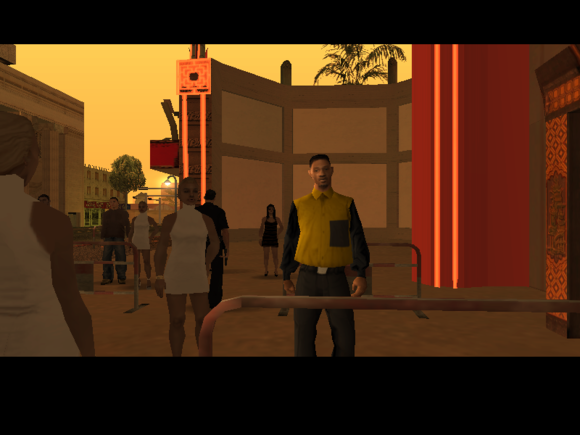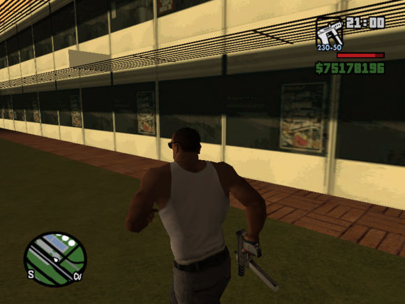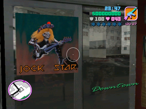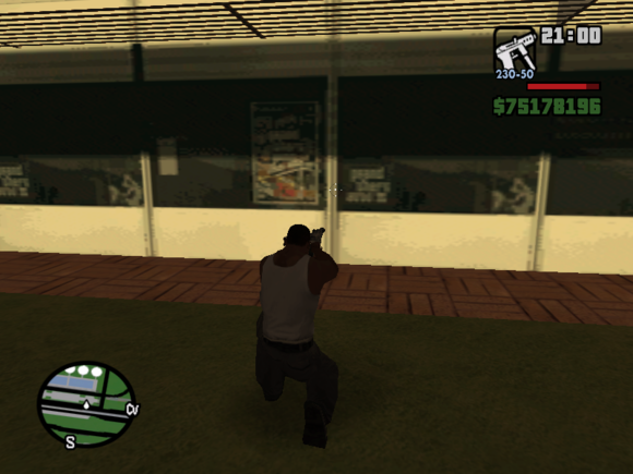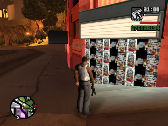 38.圣辉洛西区的一个购物中心的墙上张贴有《罪恶都市》和《GTA3》的封面和宣传图。