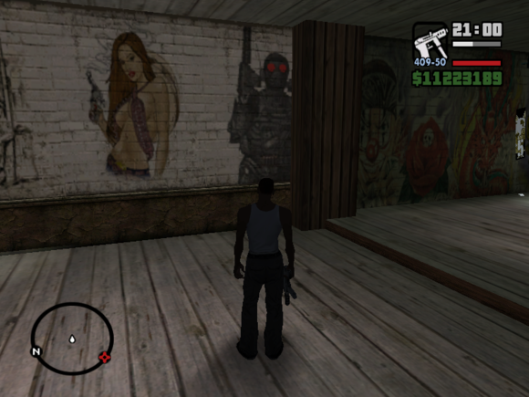 25.歌舞厅附近的一堵墙上张贴有GTA3的人物肖像,从左起依次为8号球、埃尔 布罗、加濑建斯和凯特琳娜。
