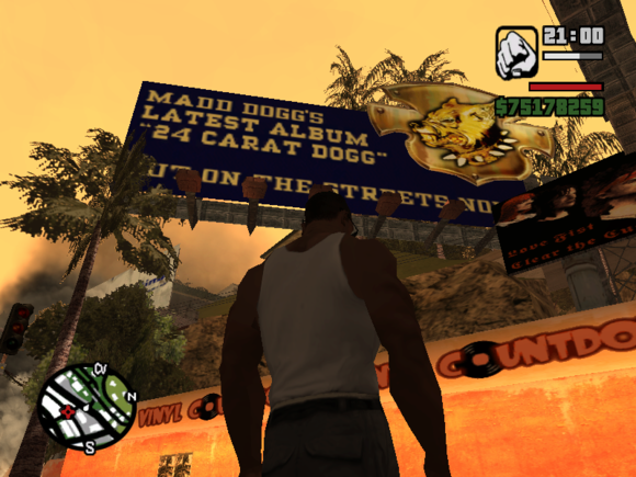 14.洛圣都的一条街道上面有“暴力至上”乐队的广告牌和疯狗多特个人的广告牌。