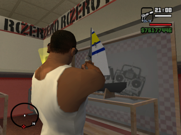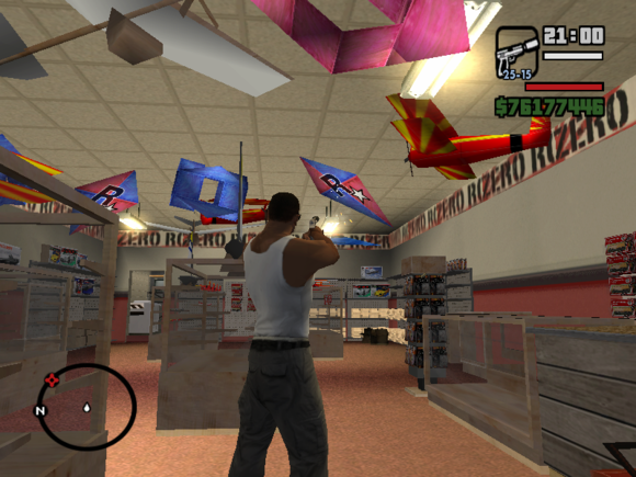31.泽罗模型店中有汤米和兰斯的塑胶娃娃模型,以及带有R星标志的帆船模型和风筝。