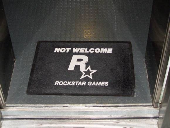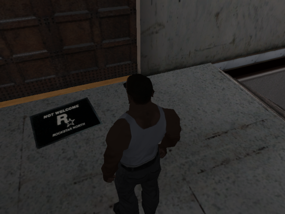 45. 斯莫克的制毒工厂的顶楼那里有一块地毯,上面写着“Not Wellcome”(不欢迎),并且还清清楚楚的署名了“R星游戏公司“,这块地毯其实在现实生活中是同样存在的,R星在英国爱丁堡设立的一个工作室的电 梯口门前就有这块地毯。这个彩蛋暗指了R星总部不欢迎反对党。