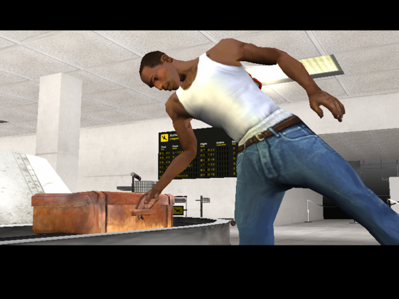 55.洛圣都的机场航空管制显示银幕上面有到“东京”和到“罪恶都市”的航班。