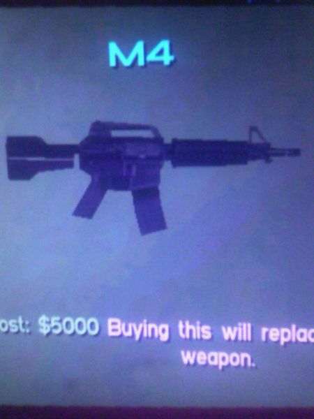GTASA: 移动射击、快速恢复准星、持枪姿势酷。这把武器让玩家能以极其微细的精确度来瞄准对手某一部位或是汽车轮胎。跪下射击能大大提高M4的精确性,在使用这把 武器的时候尽量蹲下。而且在跪下射击的时候,同样可以左、右滚翻,躲避子弹后继续射击。 (许多枪蹲下来都会提高准度的,这个更明显)