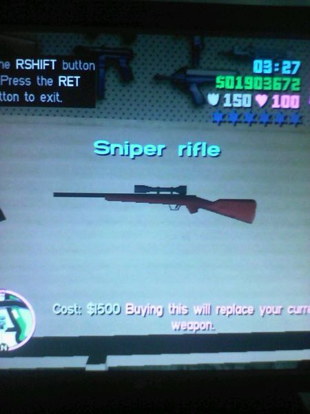 GTAVC:狙击爆头,爆车(静止状态)。杀人很好,但是射速慢,所以爆车就不推荐了。豪宅院子里捡取(妈弹的迷宫),桥墩处捡取(下去上不来),北点商场枪店购买。